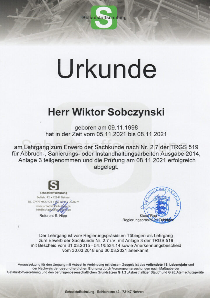 Unsere Mitarbeiter verfügen über 20 Jahre Berufserfahrung im Bereich der Kernbohrungen und Betonsägen. Mit modernster Technologie können wir fast alle Wünsche im Bereich der Betonbearbeitung umsetzen. Des Weiteren führen wir die fachgerechte Schadstoffsanierung entsprechend der Technischen Regeln für Gefahrenstoffe TRGS 519 und TRGS 521 durch.